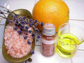 ヒマラヤ岩塩、有機栽培ラベンダーエッセンシャルオイル、スイートオレンジエッセンシャルオイル、ホホバオイル