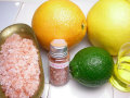 ヒマラヤ岩塩、スイートオレンジエッセンシャルオイル、グレープフルーツエッセンシャルオイル、ベルガモットエッセンシャルオイル、ホホバオイル